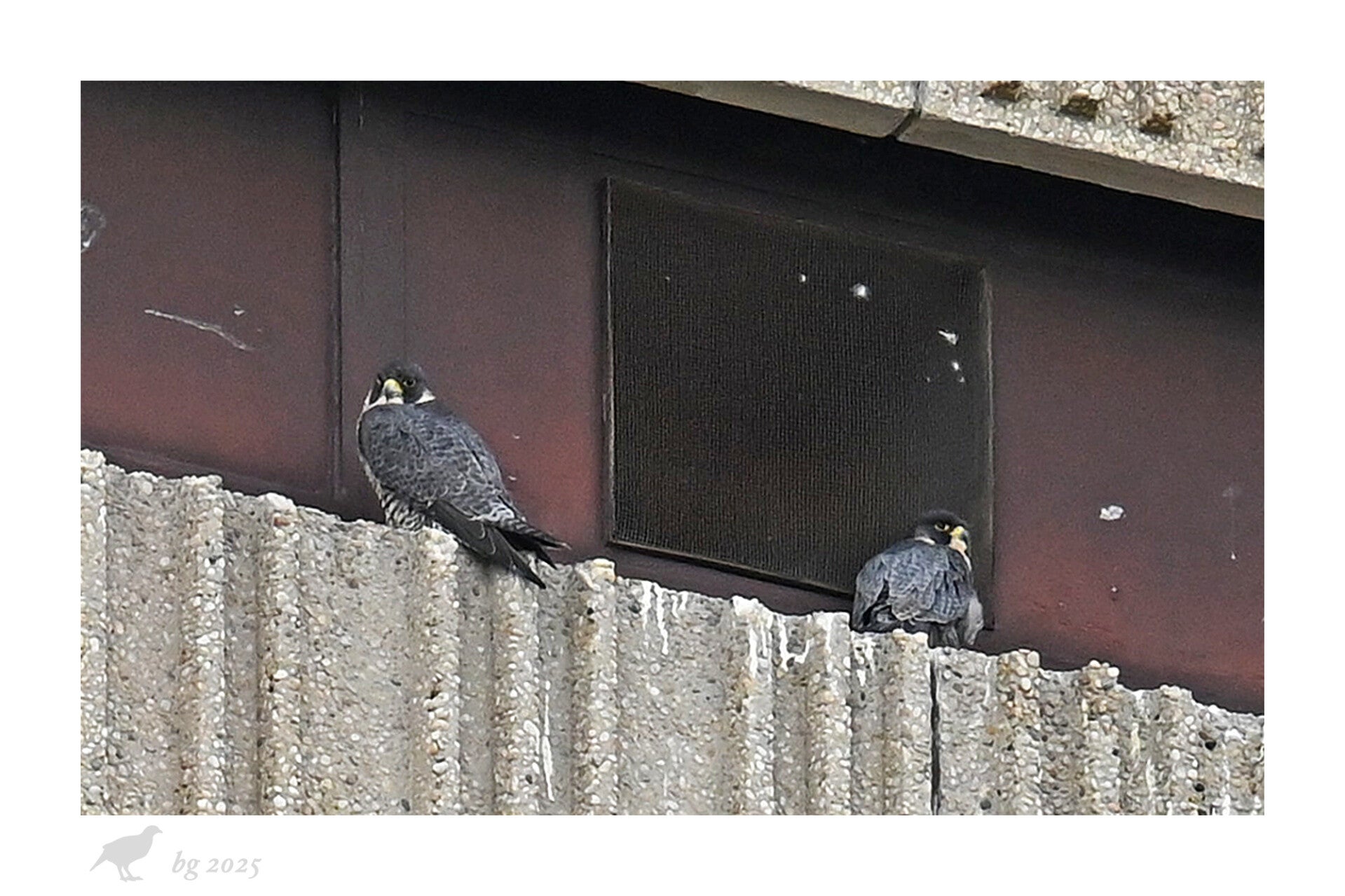 14-06-2025 De HMC-Slechtvalken op mast 8, links het jonge vrouwtje en rechts man met prooi (meer)