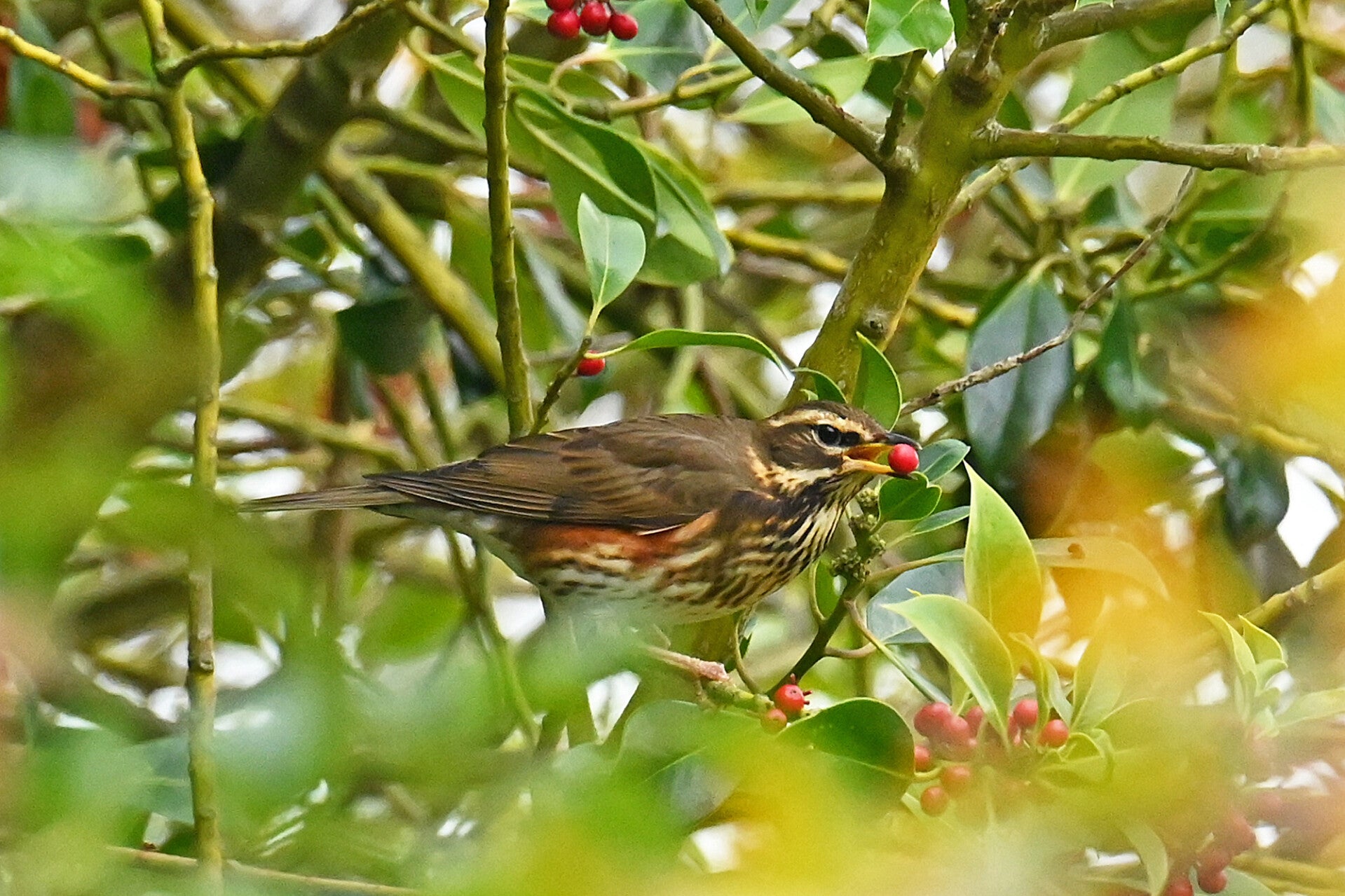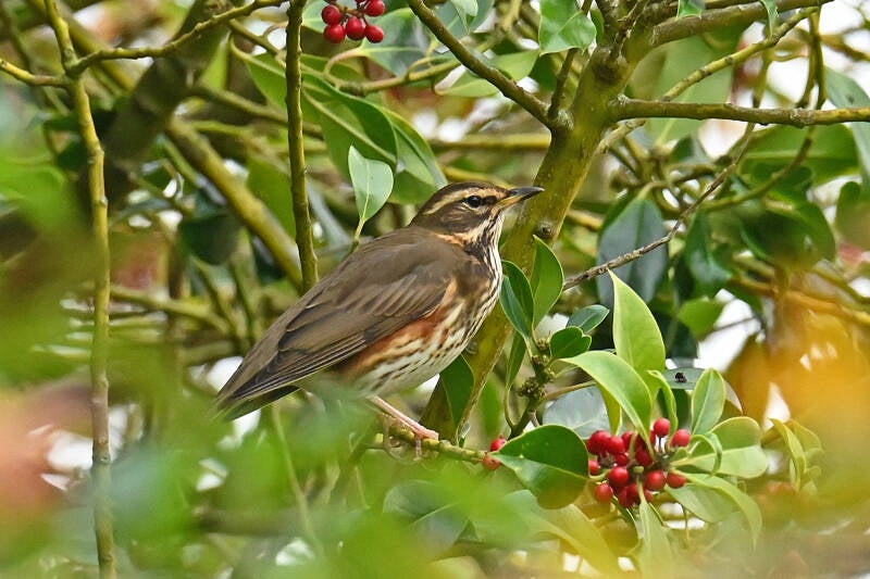 Afgelopen weken trokken vele Koperwieken door het land. Ook rond ons huis hebben we genoten van deze fraaie vogels die zich volop tegoed deden aan de bessen van o.a. Meidoorn en Hulst.