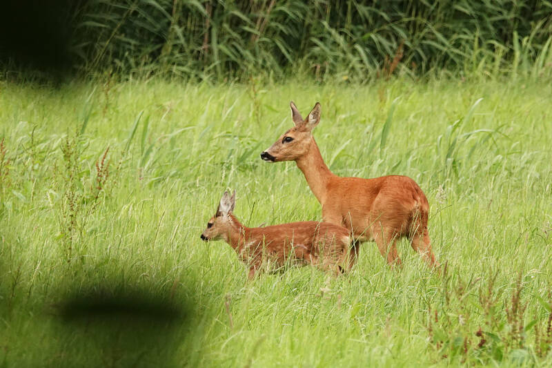 Maandag 8 juli, een fietsrondje langs de Landgoederen van Wassenaar. Aangekomen bij De Horsten trok een roodbruine vlek mijn aandacht en toen ik dichterbij kwam zag ik een Reegeit grazen in een mooi weiland. Afgestapt en een minuut later kwam een Kalfje uit het hoge gras op haar af om te drinken. Ze liepen daarna rustig rond en even zelfs liep de kleine in mijn richting om daarna toch maar om te keren.