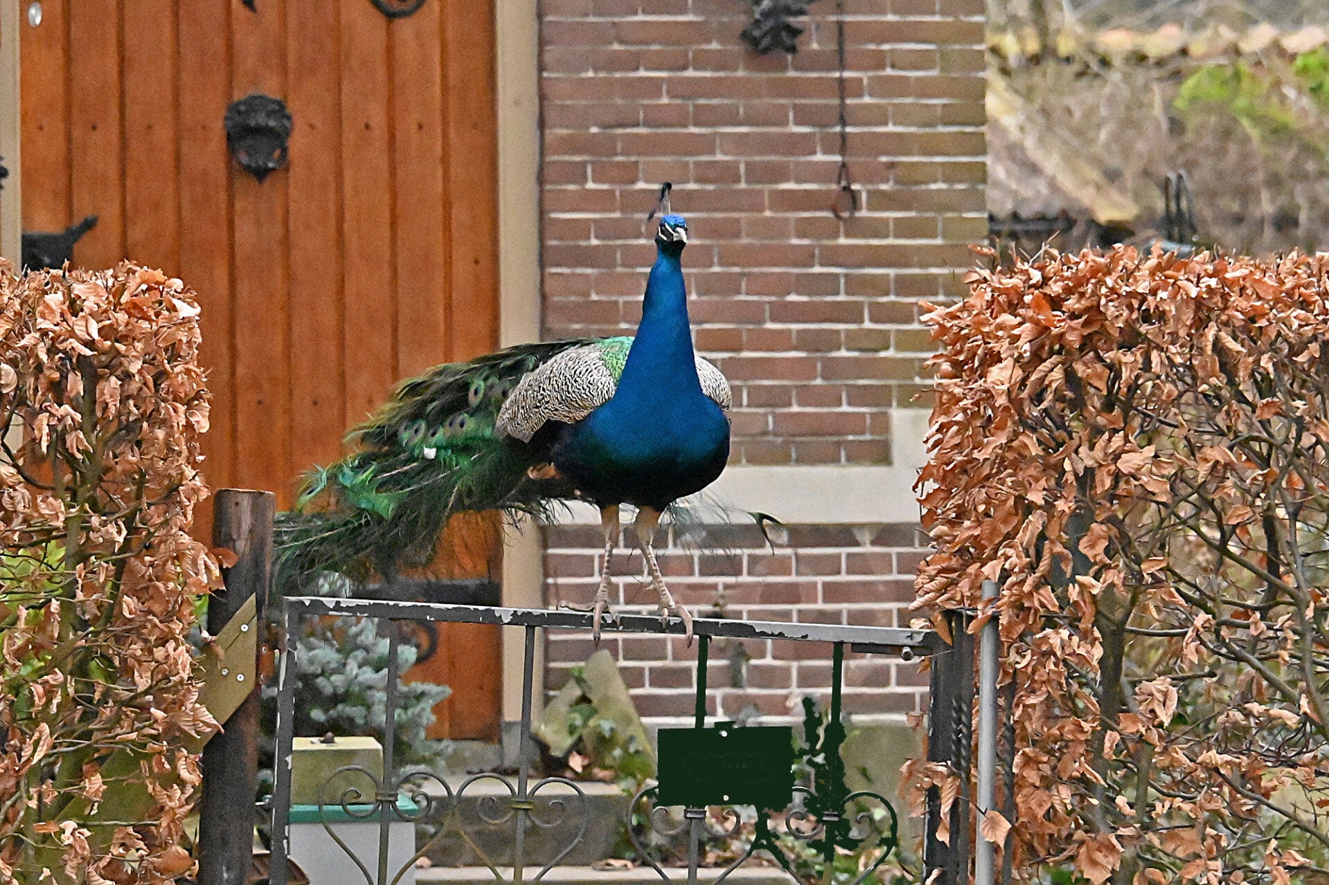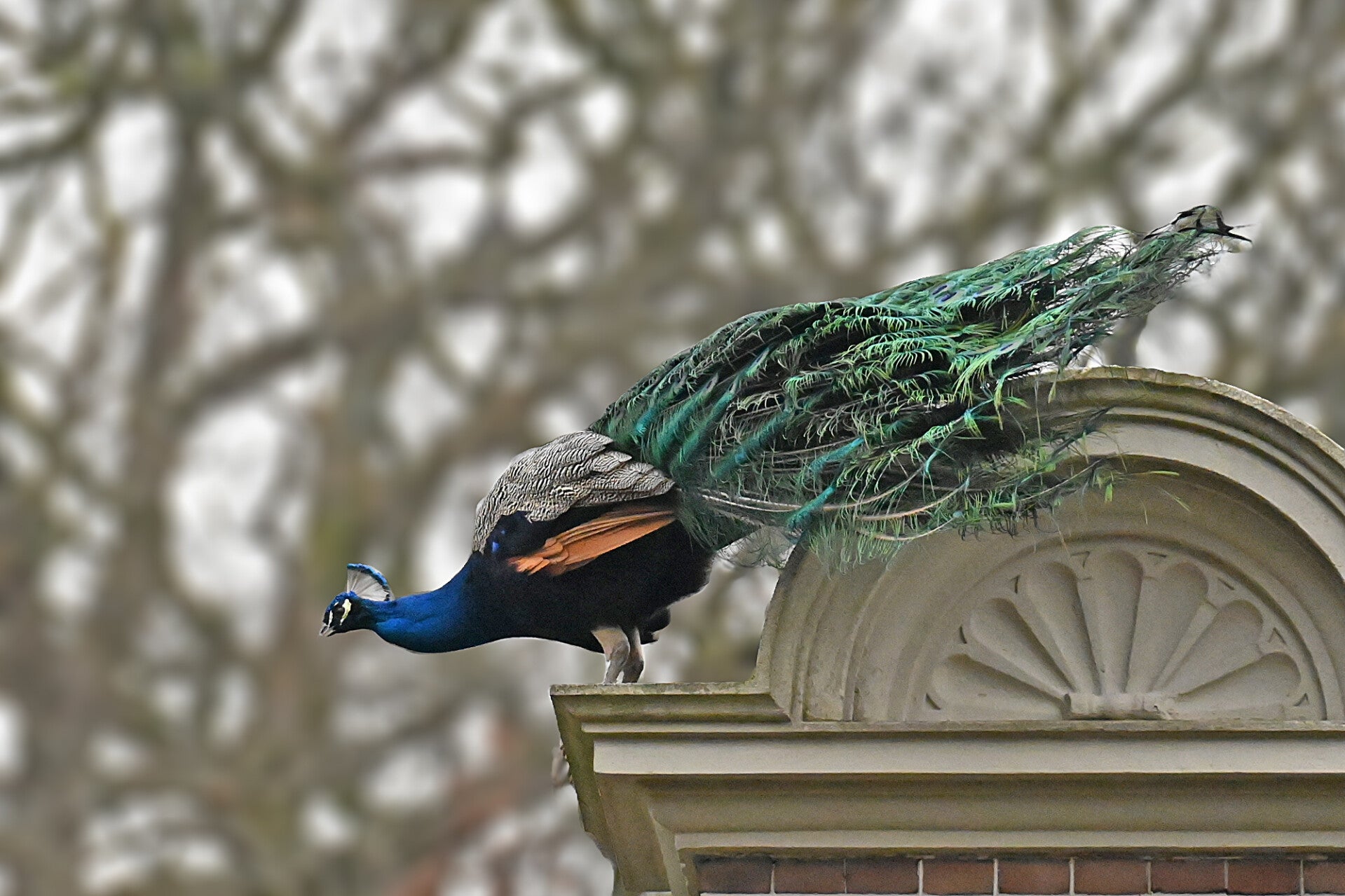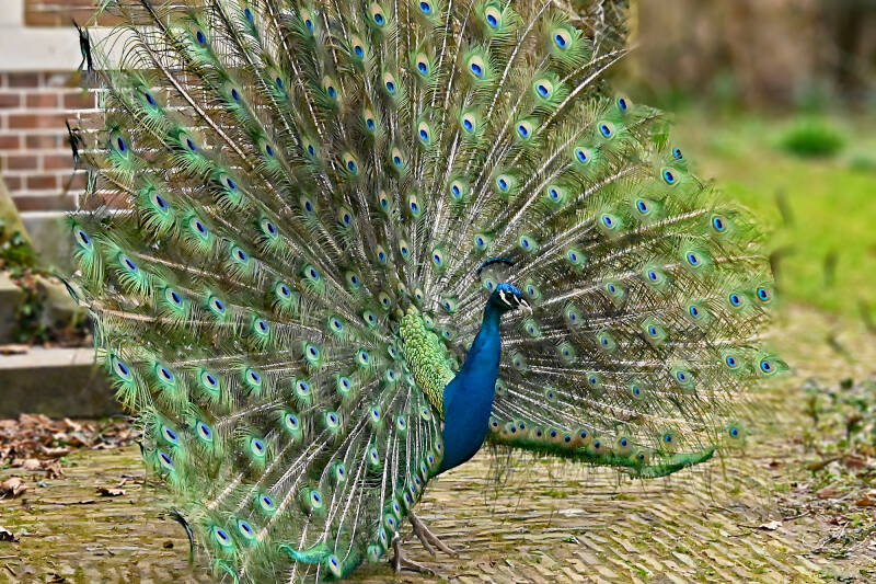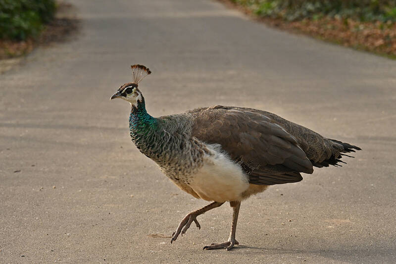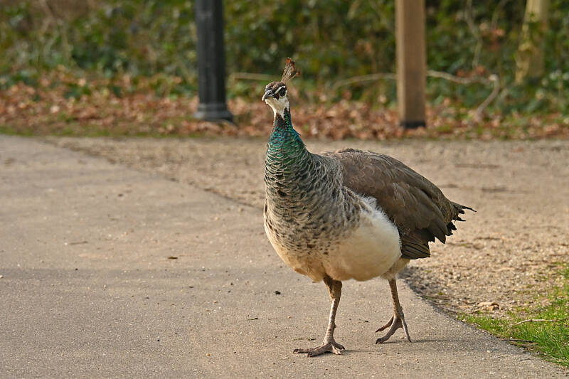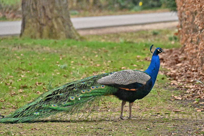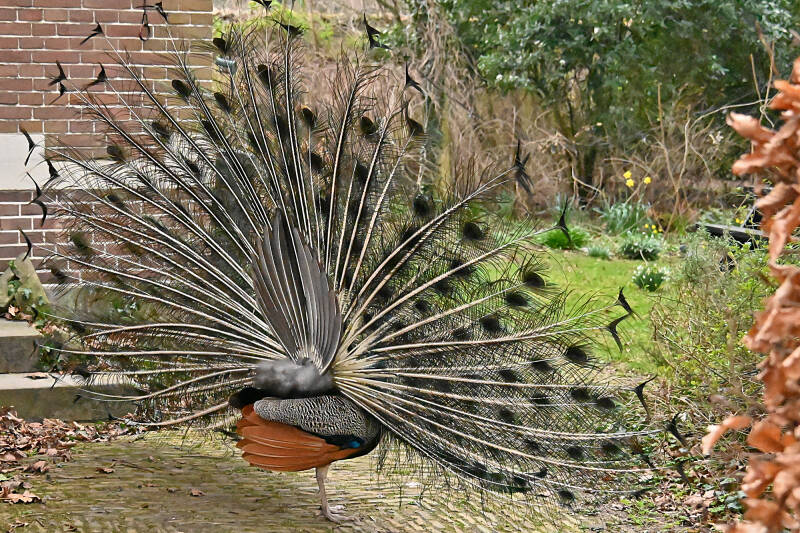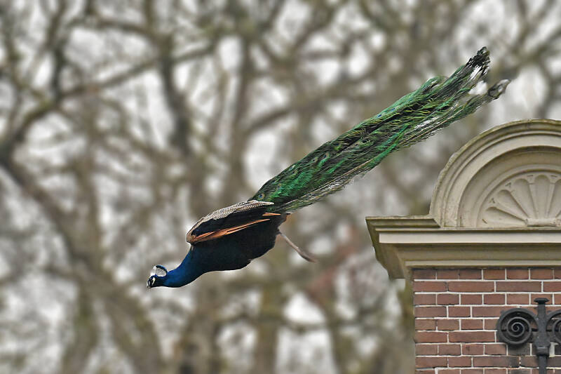 Vandaag (vrijdag 6 maart) rondje kasteel op Landgoed Duivenvoorde gelopen; meteen bij aankomst de bekende Pauwen in beeld. En ..., bij vertrek zaten er twee op de nok van de 'poortwoning' fraai in beeld. Nog mooier werd het toen ze aan de afdaling begonnen en het mannetje daarna zijn verenkleed toonde.